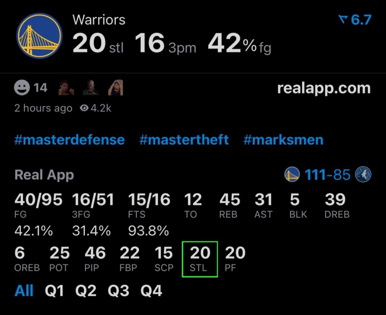 本场比赛,勇士的防守十分出色,全队共送出多达20次抢断,创本赛季至今所有比赛中抢断最高纪录!
